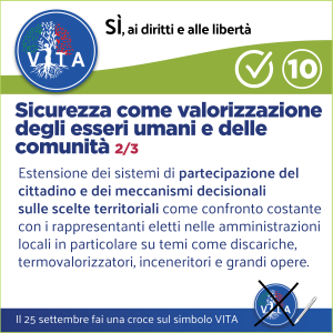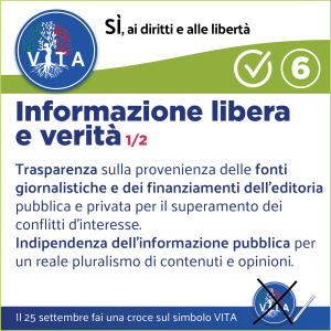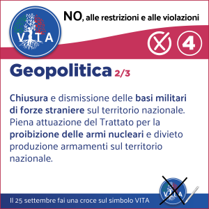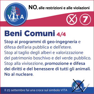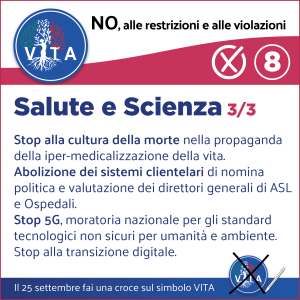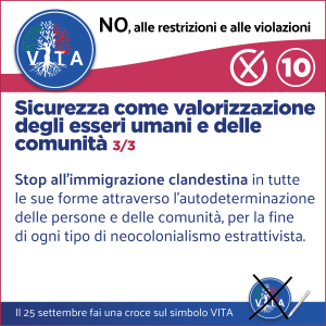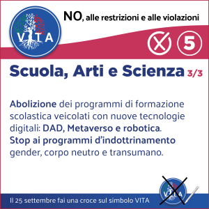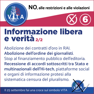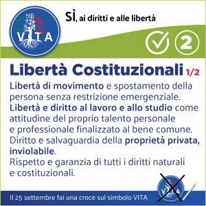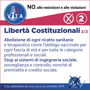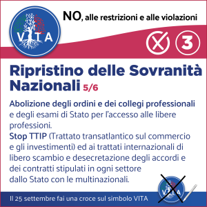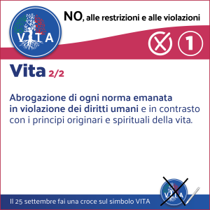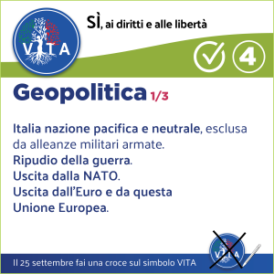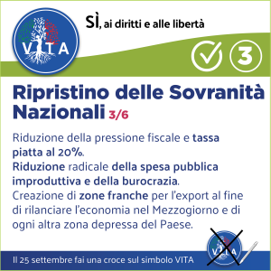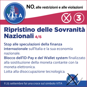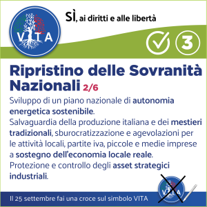 Il programma VITA, la nostra occasione di riscossa nazionale, da cui potrà ripartire un mondo nuovo nel rispetto del diritto inalienabile di tutte le espressioni e manifestazioni della VITA, con il ripristino di tutte le libertà naturali e costituzionali.